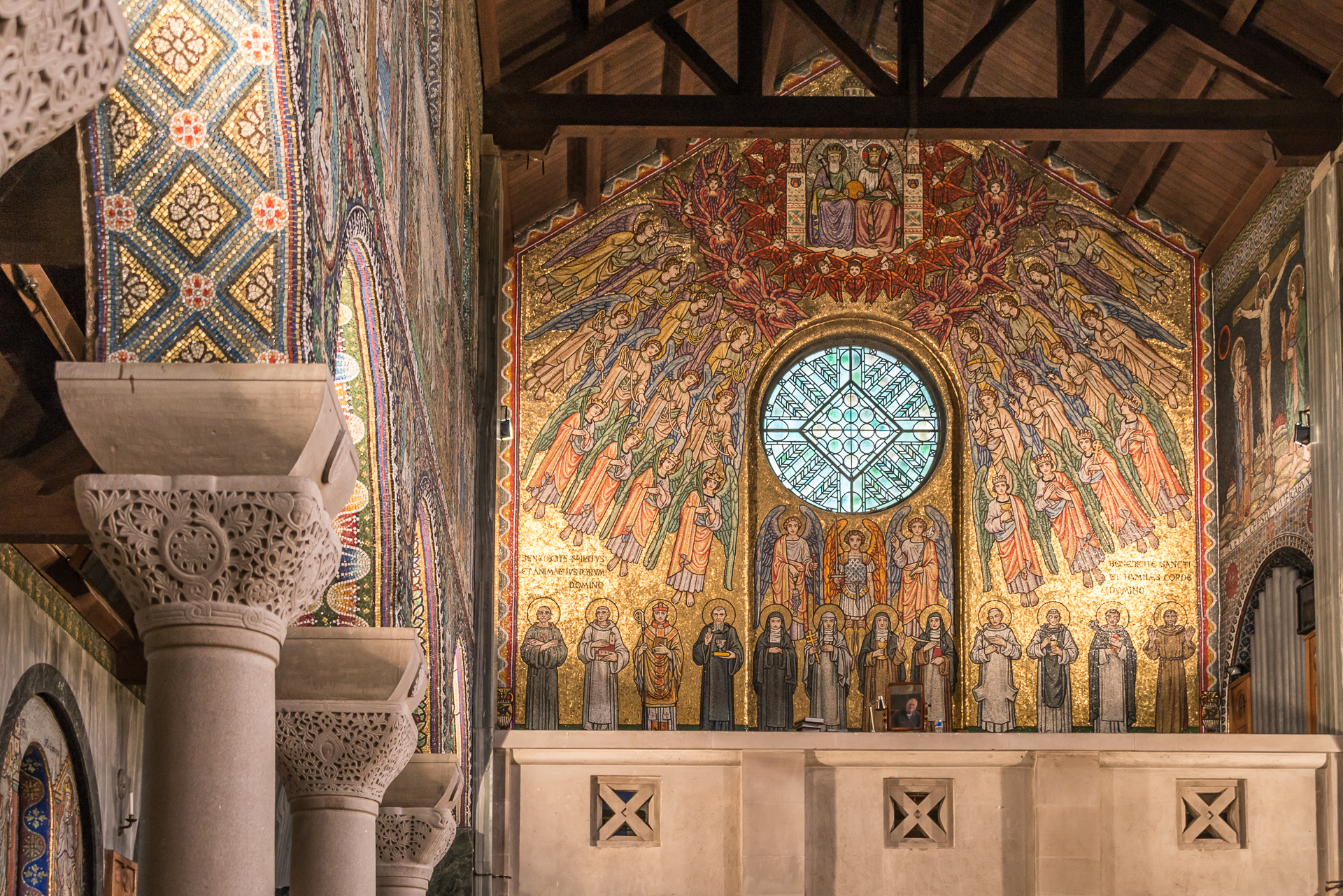 Holy Trinity, the Archangels, nine choirs of angels, Seraphim and Cherubim and, at the foot, twelve Saints