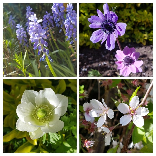 Spring is well under way. The daffs and crocuses are done, grape hyacinths are hanging on in there and anemones (a few) in fine fettle.