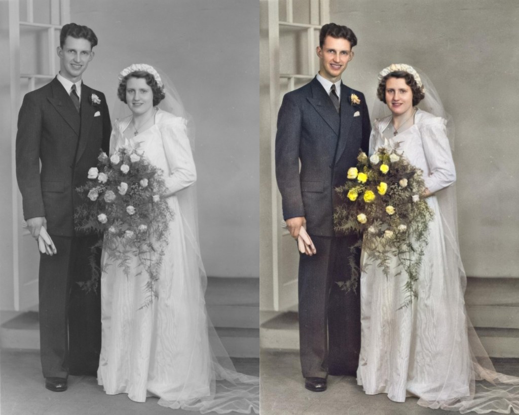 The other day I had a play with a couple of online colourising tools. It was coming up to what would have been my parents’ 70th wedding anniversary, so I played with a few photos to post elsewhere on the day and just for fun. Results differ quite significantly across the two sites, and there are limitations, but in both cases I got some pleasing results, and once colourised, they can be further tweaked in editing software, though I’ve left these pretty much as they came out in most cases.